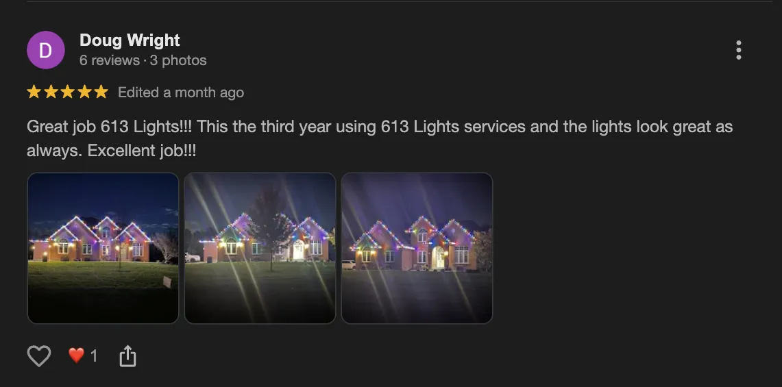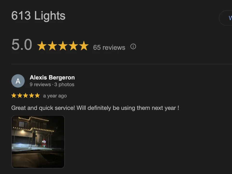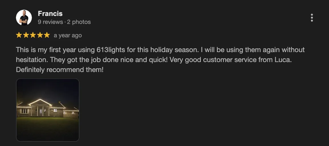 I want to first say thank you for considering 613 Lights to install beautiful lights on your Ottawa home this year.
